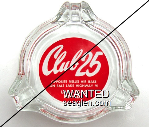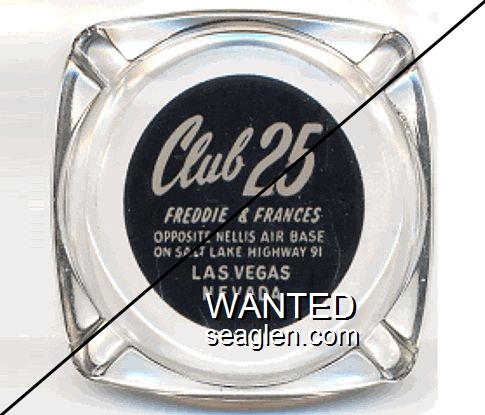 CTF-B1 Club 25 3 1/4" Clear Glass Ashtray "Club 25, Freddie & Frances, Opposite Nellis Air Base, On Salt Lake Highway 91, Las Vegas Nevada" - White on black |