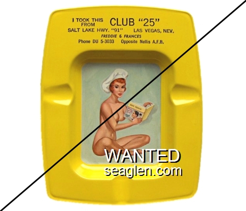CTF-C2 Club 25 3 3/4 x 4 3/4" Yellow Metal Ashtray "I took this from Club ''25'', Salt Lake Hwy. ''91'' Las Vegas, Nev., Freddie & Frances, Phone DU 5-3033, Opposite Nellis A.F.B." - Black |