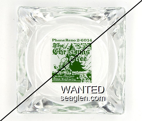 CTT-05 Christmas Tree 3 1/2" Clear Glass Ashtray "Phone Reno 2-6014, The Christmas Tree, On the Mount Rose Highway" - Green on white |