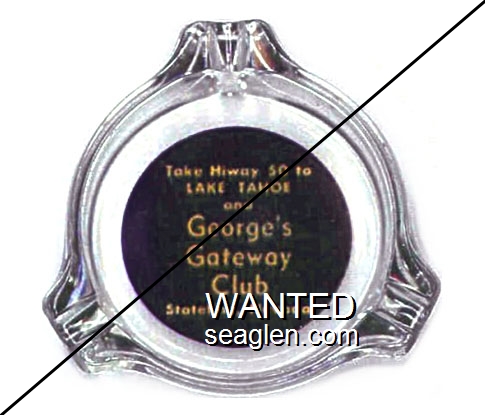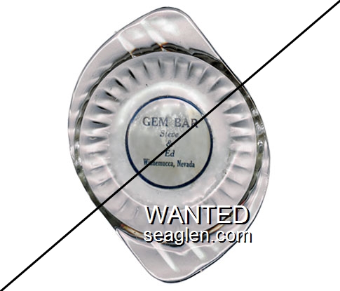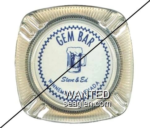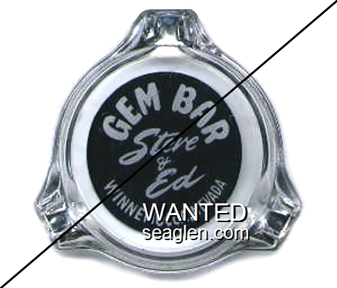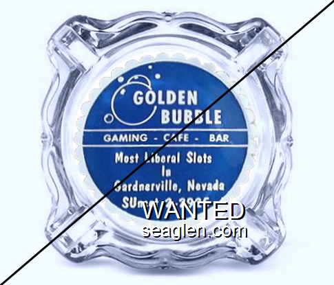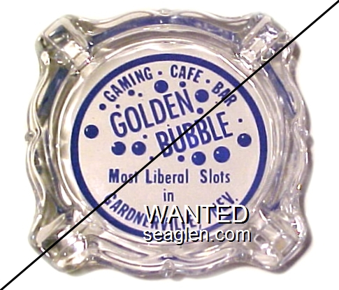 GBL-D6 Golden Bubble 3 11/16" Clear Glass Ashtray "Golden Bubble, Gaming - Cafe - Bar, Most Liberal Slots in Gardnerville Nevada, SUnset 2-2925" - White on blue |