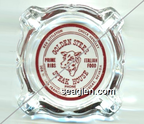 GSS-B1 Golden Steer Steak House 3 11/16" Clear Glass Ashtray "Rex Littleton, Chuck Hensley, Golden Steer Steak House, Prime Ribs, Italian Food, Phone DU 4-4470, 308 W. San Francisco, Las Vegas, Nevada" - Red (Note: Sahara Avenue was originally called San Francisco Avenue) |