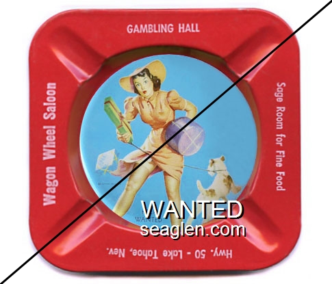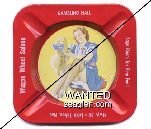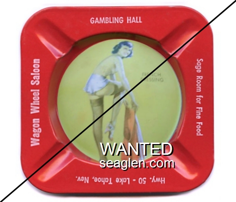 HAV-E5 Harvey's Resort Hotel & Casino 4 1/8" Red Metal Ashtray "Wagon Wheel Saloon, Gambling Hall, Sage Room For Fine Food, Hwy. 50 - Lake Tahoe, Nev., A Peek-A'-Knees" - White |