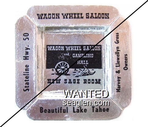 HAV-J1 Harvey's Resort Hotel & Casino 3 5/8" Silver Paper Ashtray "Wagon Wheel Saloon, Harvey & Llewellyn Gross, Owners, Beautiful Lake Tahoe, Stateline Hwy. 50, Wagon Wheel Saloon and Gambling Hall, New Sage Room" - Black |