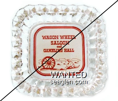 HAV-N1 Harvey's Resort Hotel & Casino 4 1/2" Clear Glass Ashtray "Wagon Wheel Saloon and Gambling Hall" - Red on white |