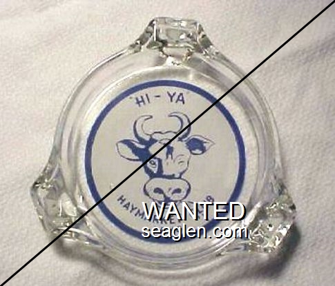 HAY-A1 Haymarket Club 3 1/2" Clear Glass Ashtray "''HI - YA'', Haymarket Club, Reno" - Blue on white |