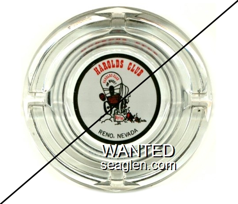 HCR-C2 Harolds Club 4 1/4" Clear Glass Ashtray "Harolds Club, Harolds Club or Bust!, Reno, Reno, Nevada" - Red and black on white |