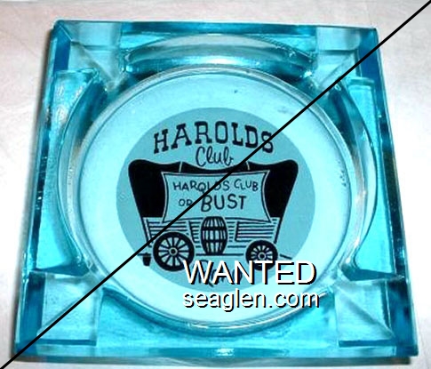 HCR-D3 Harolds Club 3 1/2" Blue Glass Ashtray "Harolds Club, Harolds Club or Bust, Reno" - Black on white (Like HCR-08, except blue glass) |