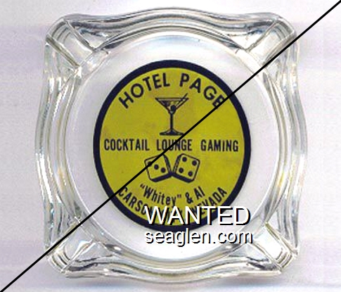 HPC-A1 Hotel Page, Carson 3 7/16" Clear Glass Ashtray "Hotel Page, Cocktail Lounge Gaming, ''Whitey'' & Al, Carson City, Nevada" - Black on yellow |