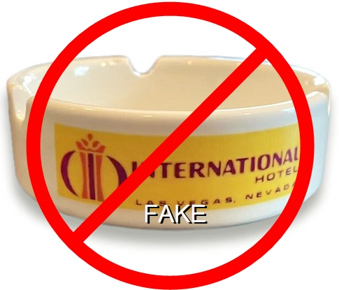 INT-91 International Hotel 4" White Porcelain Ashtray "International Hotel, Las Vegas, Nevada" - Red on yellow (A reproduction ashtray being sold on eBay c. 2023) |