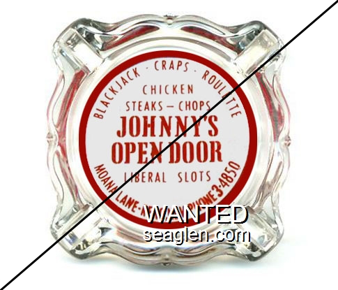 JOD-A1 Johnny's Open Door 3 11/16" Clear Glass Ashtray "Blackjack - Craps - Roulette, Chicken, Steaks - Chops, Johnny's Open Door, Liberal Slots, Moana Lane - Reno, Nev. - Phone 3-4850" - Red on white |