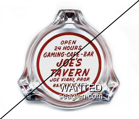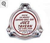 JTV-A1 Joe's Tavern 3 1/2" Clear Glass Ashtray "Open 24 Hours Gaming - Cafe - Bar, Joe's Tavern, Joe Viani, Prop., Hawthorne, Nev." - Red on white |