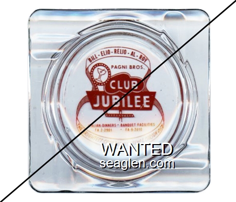 JUB-E1 Jubilee 4 1/4" Clear Glass Ashtray "Bill - Elio - Relio - Al - Roy, Pagni Bros., Club Jubilee, Italian Dinners - Banquet Facilities, FA2-2901 - FA9-3010, The Brightest Spot Between Reno and Carson City" - Red |