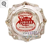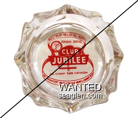 JUB-F1 Jubilee 3 3/4" Clear Glass Ashtray "Bill - Elio - Relio - Al - Roy, Pagni Bros., Club Jubilee, U.S. Hiway 395 Nevada, The Brightest Spot Between Reno & Carson City" - Red on white |