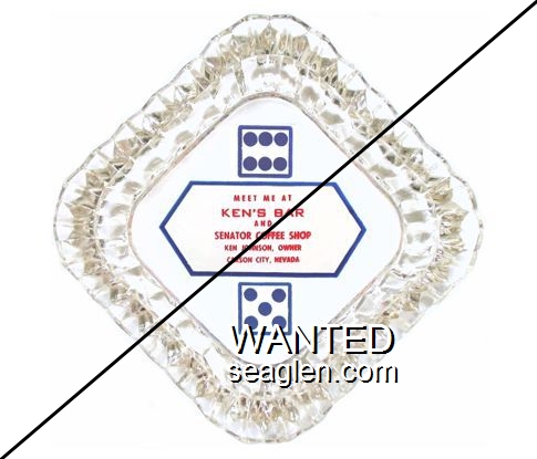 KEN-A1 Ken's Bar 4 1/2" Clear Glass Ashtray "Meet Me At Ken's Bar and Senator Coffee Shop, Ken Johnson, Owner, Carson City, Nevada" - Red and blue on white |