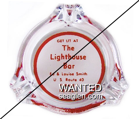 LHF-B2 Light House Bar 3 1/2" Clear Glass Ashtray "Get Lit At The Lighthouse Bar, Ed & Louise Smith, U. S. Route 40, Fernley, Nevada" - Red on white |