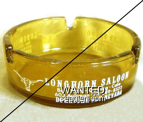 LHN-A1 Longhorn, The 3 1/2" Amber Glass Ashtray "Longhorn Saloon, Bar - Slots - Gaming - Cafe, 603 Aultman - Ph. 289-8522, Downtown Ely, Nevada" - White |