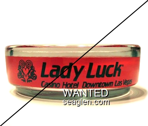 LLC-E1 Lady Luck Casino 3 1/2" Clear Glass Ashtray "Lady Luck, Casino Hotel Downtown Las Vegas" - Black on orange (No sniffers) |