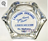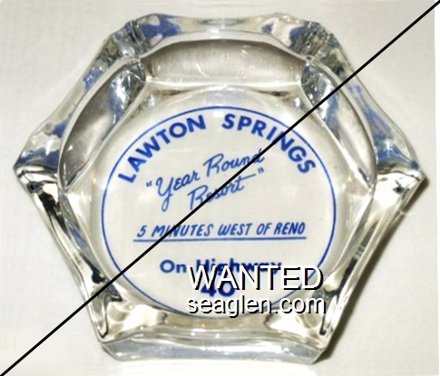 LSR-A1 Lawton Springs Resort 3 1/8" Clear Glass Ashtray "Lawton Springs, ''Year Round Resort'', 5 Minutes West of Reno, On Highway 40" - Blue on white |