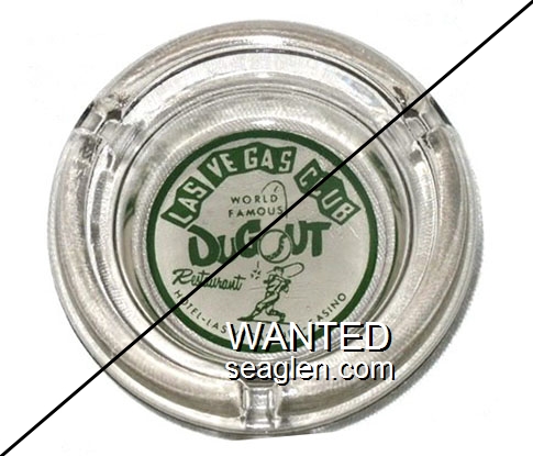 LVC-F1 Las Vegas Club 4 1/2" Clear Glass Ashtray "Las Vegas Club, World Famous Dugout Restaurant, Hotel - Las Vegas - Nev. - Casino" - Green on white |