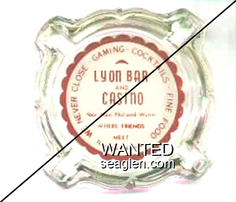LBC-01 Lyon Bar and Casino 3 11/16" Clear Glass Ashtray "We Never Close - Gaming - Cocktails - Fine Food, Lyon Bar and Casino, Your Host Phil and Wynn, Where Friends Meet, Yerington, Nevada" - Red on white |