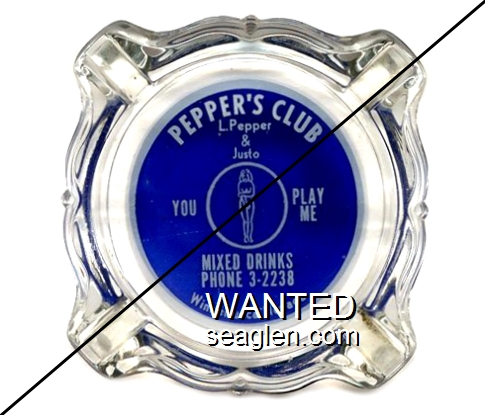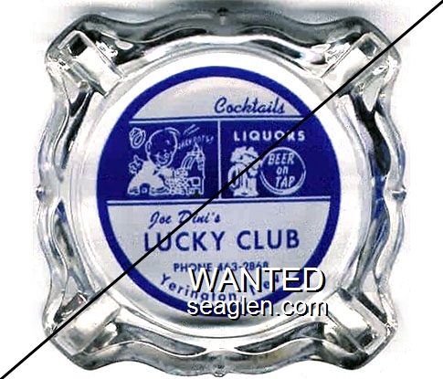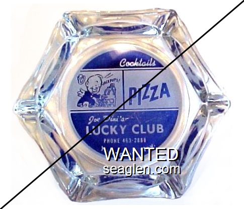 LCD-C1 Lucky Club, Joe Dini's ?" Clear Glass Ashtray "Cocktails, Pizza, Joe Dini's Lucky Club, Phone 463-2868, Yerington, Nev." - Blue on white |