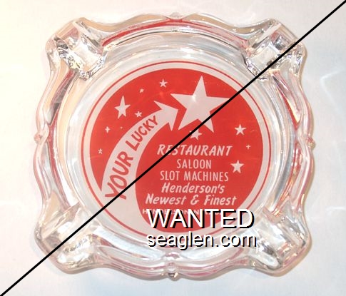 LSH-B1 Lucky Star Club ?" Clear Glass Ashtray "Your Lucky (Star) Restaurant, Saloon, Slot Machines, Henderson's Newest & Finest, Henderson, Nevada" - White on blue |