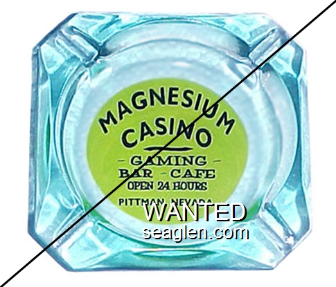 MAG-A1 Magnesium Casino 3 1/2" Blue Glass Ashtray "Magnesium Casino, Gaming - Bar - Cafe, Open 24 Hours, Pittman, Nevada" - Black on yellow |