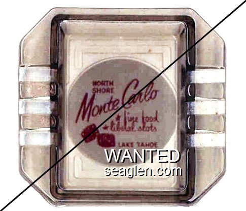 MCJ-C2 Monte Carlo, Joby's 3 9/16 x 3 3/8" Smoke Glass Ashtray "North Shore Monte Carlo, fine food - liberal slots, Lake Tahoe" - Red on white |
