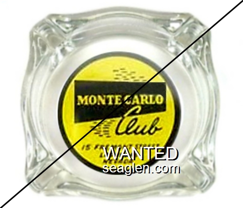 MCV-A3 Monte Carlo Club 4 1/4" Clear Glass Ashtray "Monte Carlo Club, Home of More Jackpots, 15 Fremont Street, Las Vegas, Nevada" - Black and red on yellow |