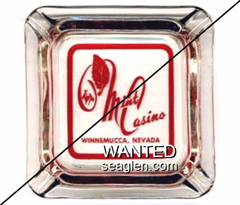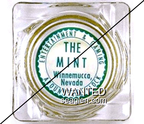 MIW-A1 Mint, Winnemucca 4 1/2" Clear Glass Ashtray "Entertainment & Gaming Around The Clock, The Mint, Winnemucca, Nevada" - Green on white |