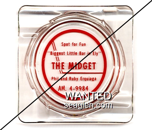 MID-B1 Midget Bar 4 1/4" Clear Glass Ashtray "Spot for Fun, ''Biggest Little Bar in Ely'', The Midget, Phil and Ruby Erquiaga, AM. 4-9984" - Red |