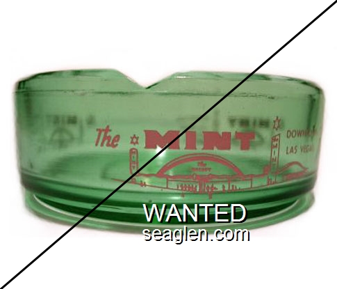 MIN-H8 Mint 4" Green Glass Ashtray "The Mint, Coining Pleasure All The Time, 110 Fremont St., Downtown Las Vegas, Nev., DU 22244" - Black on red |