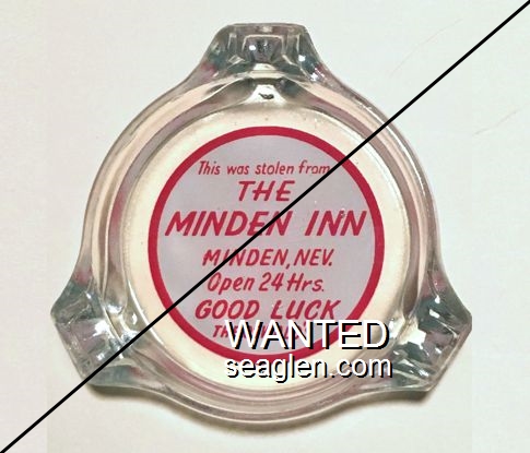 MND-E1 Minden Inn 3 1/2" Clear Glass Ashtray "This was stolen from The Minden Inn, Minden, Nev., Open 24 Hrs, Good Luck, The Oswald's" - Red on white |