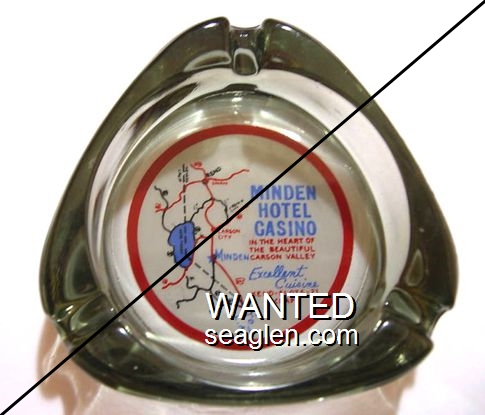MNH-A1 Minden Hotel 3 1/2" Clear Glass Ashtray "Minden Hotel Casino, In The Heart Of The Beautiful Carson Valley, Excellent Cuisine, Keno - Slots - 21, Craps" - Blue and red on white |
