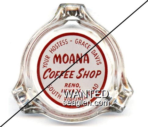 MOA-A1 Moana Coffee Shop 3 1/4" Clear Glass Ashtray "Your Hostess - Grace Davis, Moana Coffee Shop, Reno, Nevada, South Virginia Road" - Red on white |