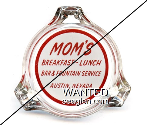 MOM-A1 Mom's 3 1/4" Clear Glass Ashtray "Mom's, Breakfast - Lunch, Bar & Fountain Service, Austin, Nevada" - Red on white |