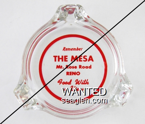 MSA-A2 Mesa, The 3 1/4" Clear Glass Ashtray "Remember The Mesa, Mt. Rose Road, Reno, Food With a View" - Red on white |