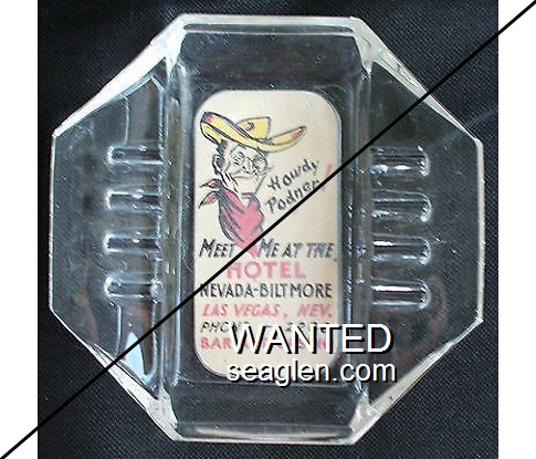 NBH-C1 Nevada Biltmore Hotel 5" Clear Glass Ashtray "Howdy Podner!, Meet Me at the Hotel Nevada - Biltmore, Las Vegas, Nev., Phone - 2200, Bar and Casino" - Black and red on white (SAFEX style) |
