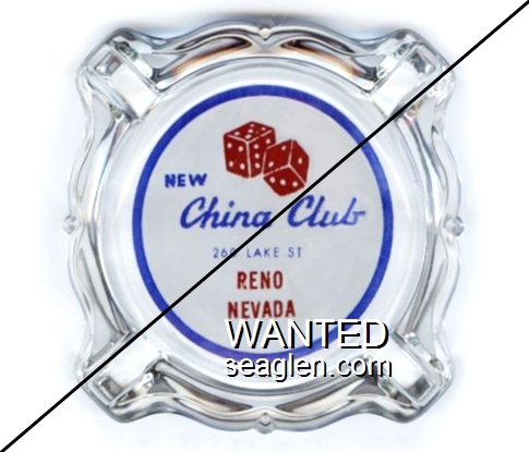 NCC-N1 New China Club 3 11/16" Clear Glass Ashtray "New China Club, 260 Lake St., Reno, Nevada" - Red and blue on white |