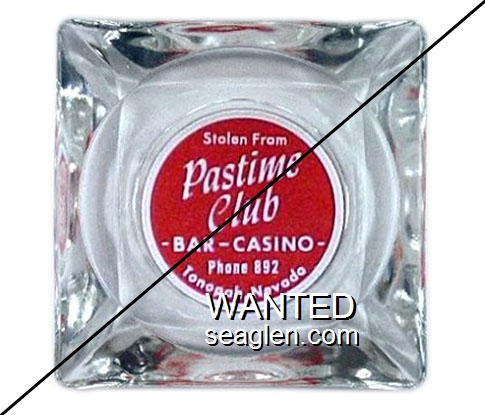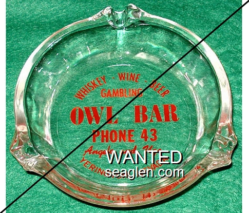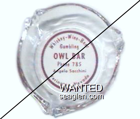 OBY-A1 Owl Bar (Yerington) ?" Clear Glass Ashtray "Whiskey - Wine - Beer, Gambling, Owl Bar, Phone 786, Angelo Sacchini, Yerington, Nevada" - Red on white |