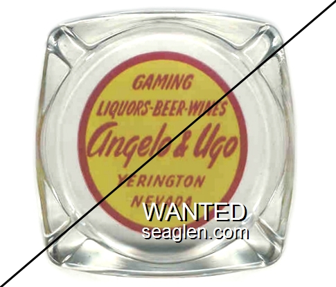 OBY-B1 Owl Bar (Yerington) 3 1/4" Clear Glass Ashtray "Gaming, Liquors - Beer - Wines, Angelo and Ugo, Yerington, Nevada" - Red on yellow |