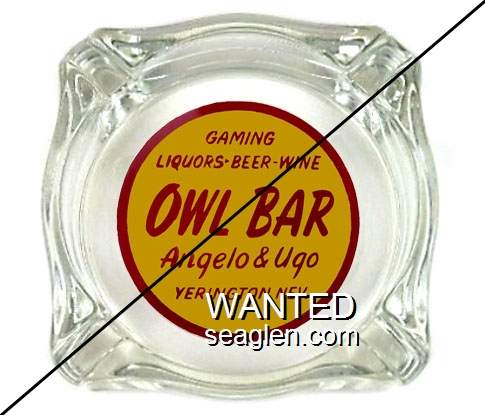 OBY-B2 Owl Bar (Yerington) 3 7/16" Clear Glass Ashtray "Gaming, Liquors - Beer - Wine, Owl Bar, Angelo & Ugo, Yerington, Nev." - Red on yellow |