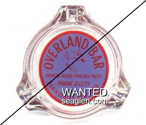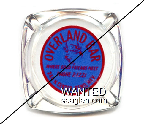OVB-A1 Overland Bar 3 1/4" Clear Glass Ashtray "Overland Bar, Where Good Friends Meet, Phone 2-1221, 244 No. Center, Reno, Nev." - Red on blue |
