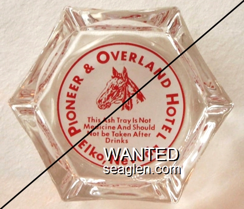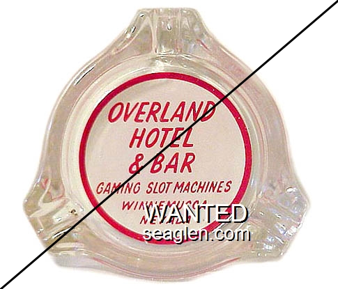 OVW-A1 Overland Bar - Winnemucca 3 1/2" Clear Glass Ashtray "Overland Hotel & Bar, Gaming Slot Machines, Winnemucca, Nevada" - Red on white |