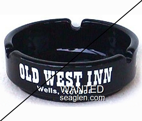 OWI-A2 Old West Inn (Wells) 3 9/16" Amethyst Glass Ashtray "Old West Inn, Wells, Nevada" - White (Large print) |