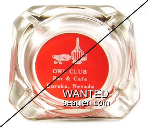 OWL-A5 Owl Club 3 1/2" Clear Glass Ashtray "Owl Club, Bar & Cafe, Eureka, Nevada" - White on red |