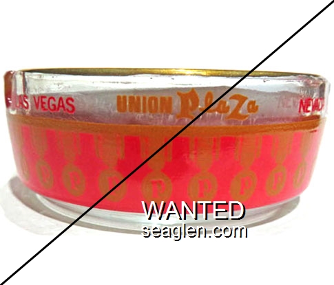 PLA-C1 Union Plaza Hotel & Casino 3 1/2" Clear Glass Ashtray "Union Plaza, Las Vegas" - Yellow and red |