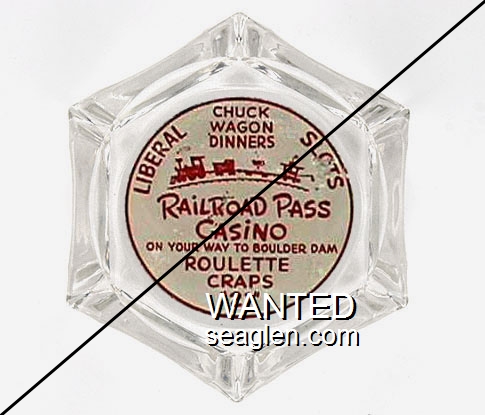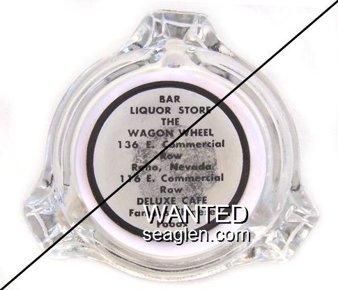 WWL-B1 Wagon Wheel 3 1/4" Clear Glass Ashtray "Bar, Liquor Store, The Wagon Wheel, 136 E. Commercial Row, Reno, Nevada, 116 E. Commercial Row, Deluxe Cafe, Famous Chinese Foods" - Black on white |
