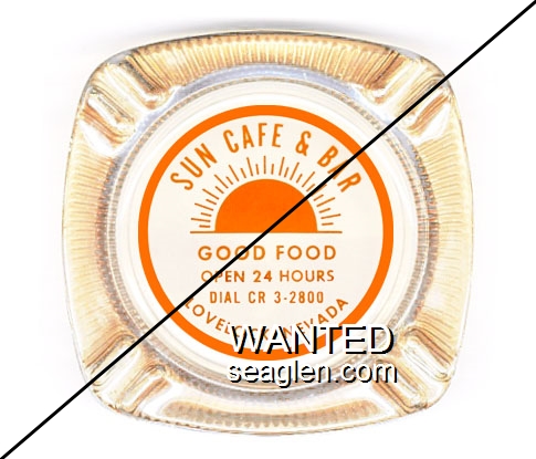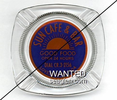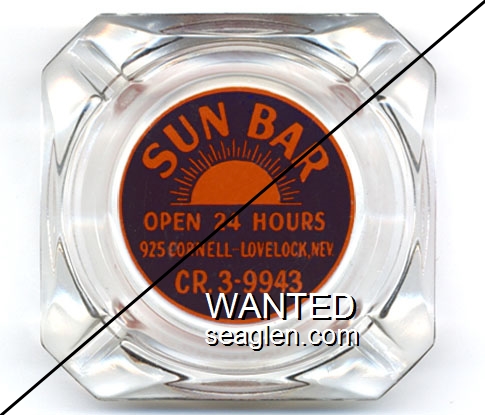 SBL-C2 Sun Bar 4 1/8" Clear Glass Ashtray "Sun Cafe & Bar, Good Food, Open 24 Hours, Dial CR.3-2156, Lovelock, Nevada" - Orange on blue |