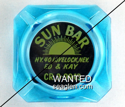 SBL-B1 Sun Bar 3 1/2" Blue Glass Ashtray "Sun Bar, Hy. 40 Lovelock, Nev., Ed & Kay, CR.3-9943" - Yellow on black |